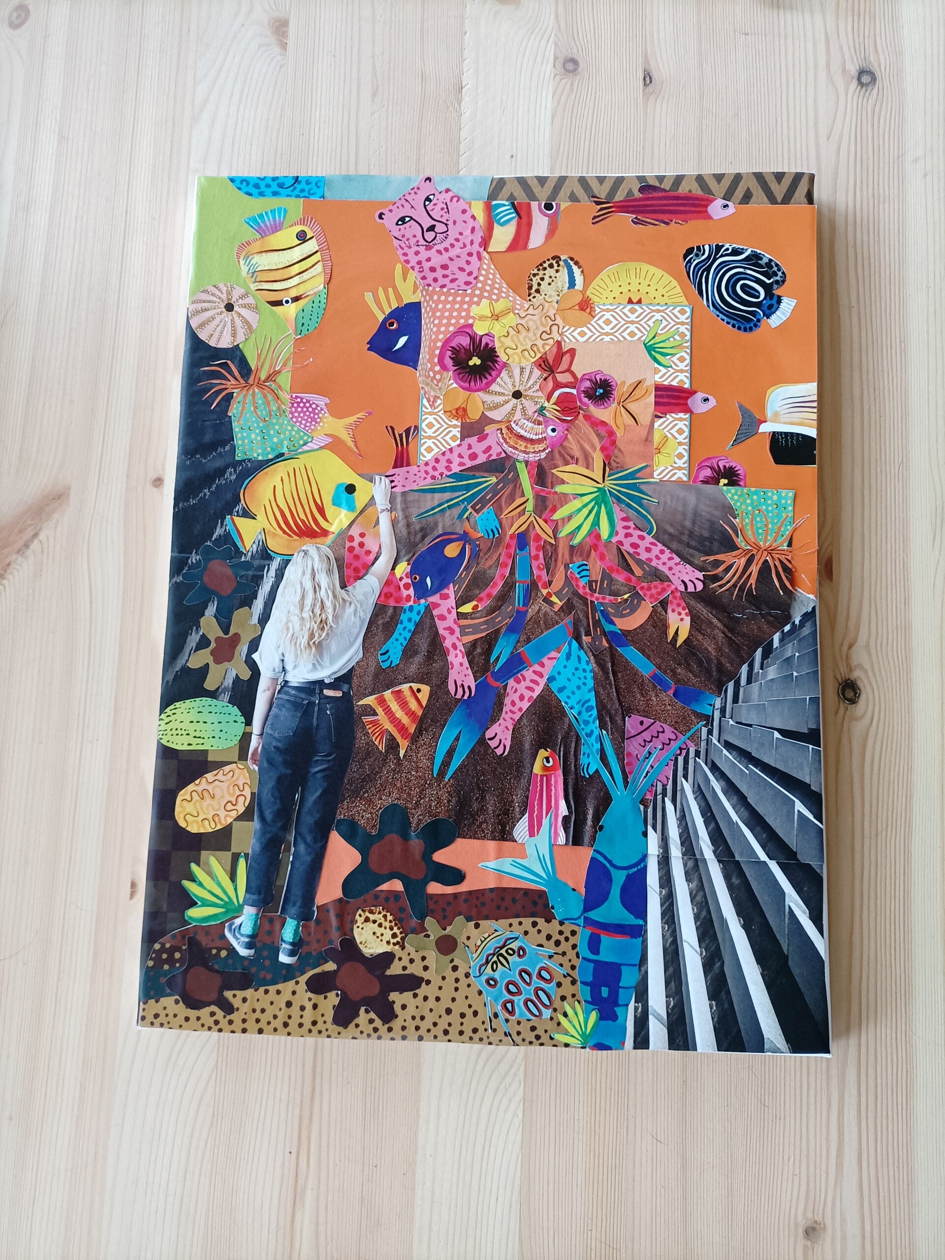 Experimenteer met verschillende kleuren materialen en technieken om een unieke collage te maken en je eigen verhaal te vertellen.